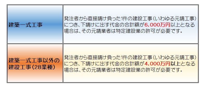 特定建設業の許可は40,000千円以上(建築工事は60,000千円以上)