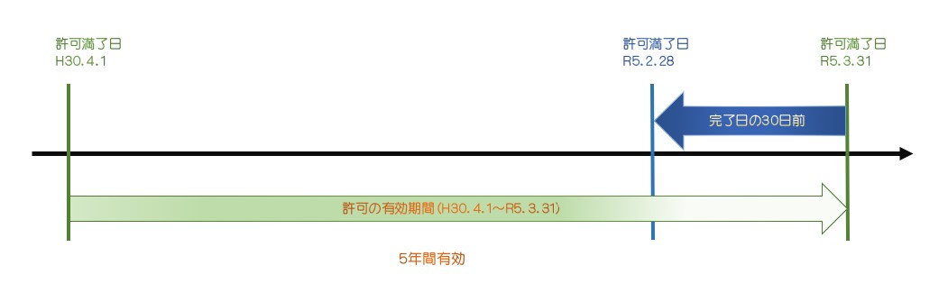 許可の有効期間は、許可日から『5年目』を経過する日の前日をもって満了になります。