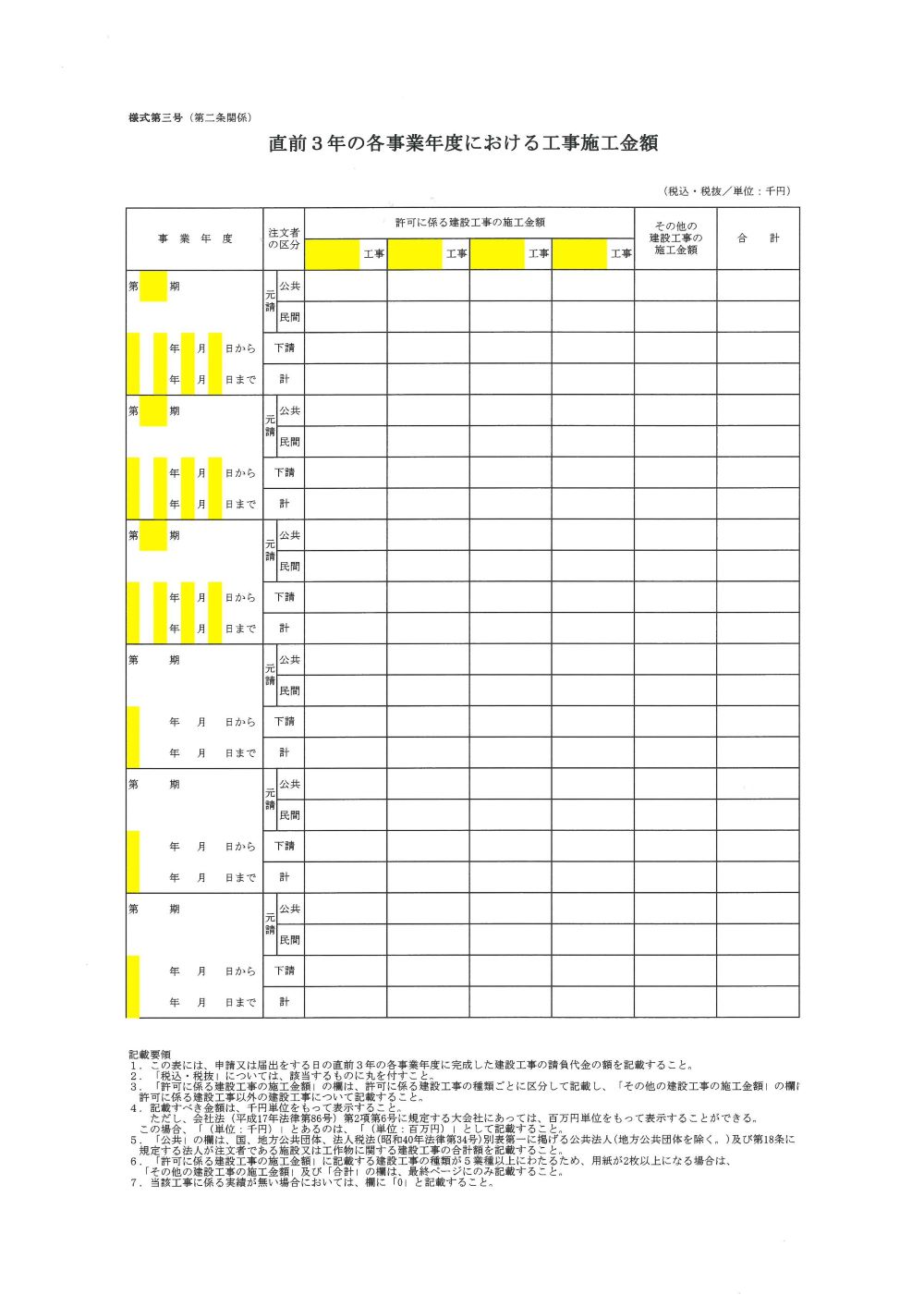 - ・様式第三号 直前3年の各事業年度における工事施工金額