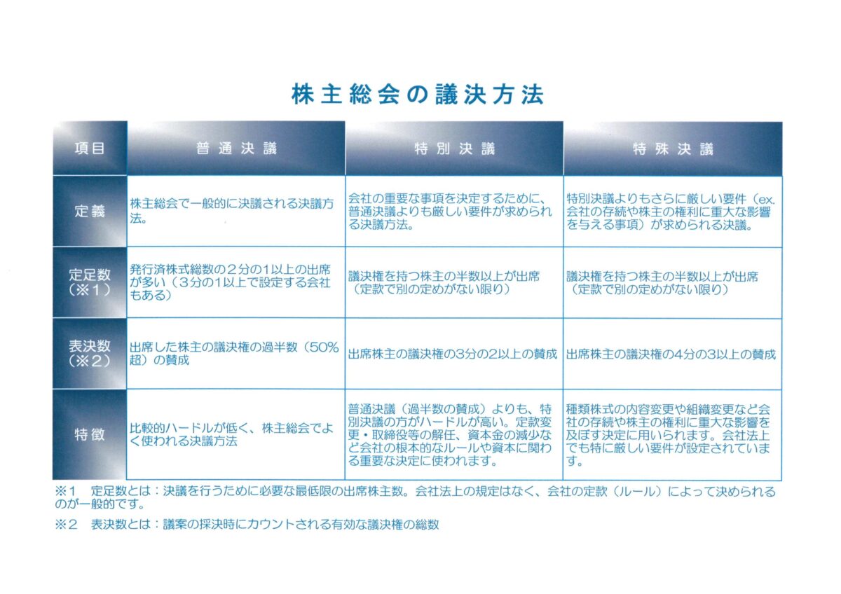 普通決議:出席株主の過半数(50%超)の賛成が必要
