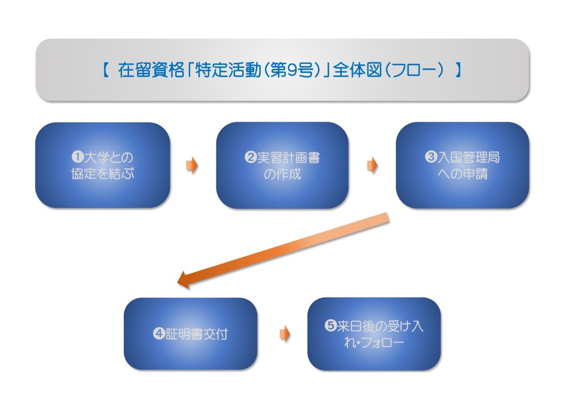 大学との協定 ⇒ 実習計画書作成 ⇒入管申請 ⇒ 来日準備