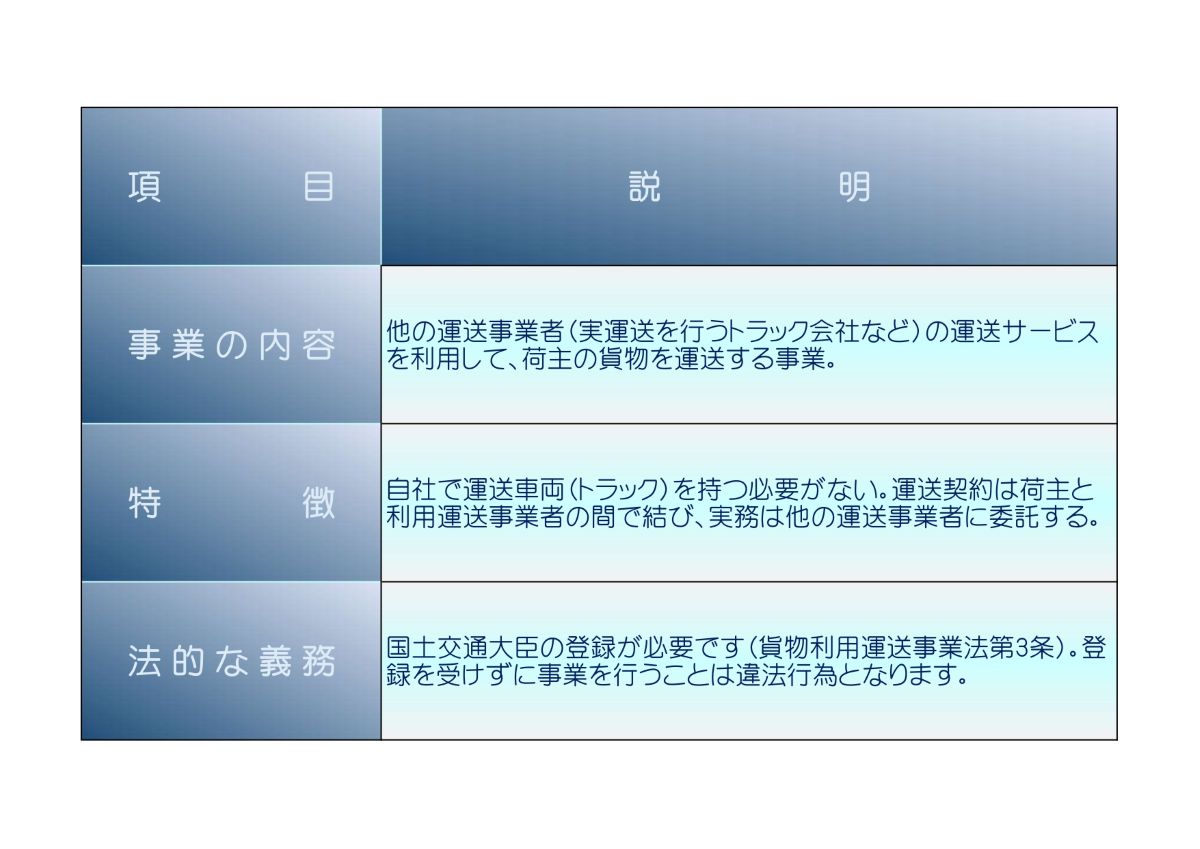 自らはトラック(運送手段)を持たずに、以下の役割を担う事業者を指します。